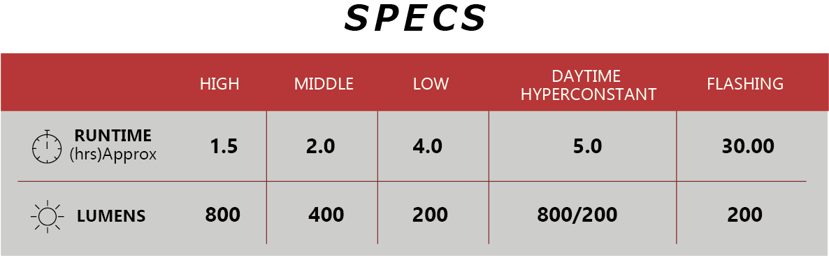 - Viisi valomoodia (High / Middle / Low / Daytime HyperConstant / Flashing)