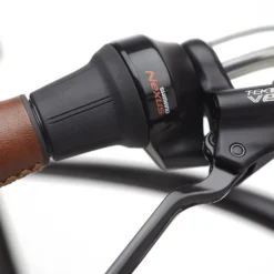 Uusi Shimano Nexus 5i napavaihteisto on helppo ja varmatoiminen, Tektro levyjarrut tuovat luotettavuutta ja mukavan leveät 26″ renkaat ovat erinomaiset kaupunkipyöräilyyn, akkutoimiset valot edessä ja takana vakiona.