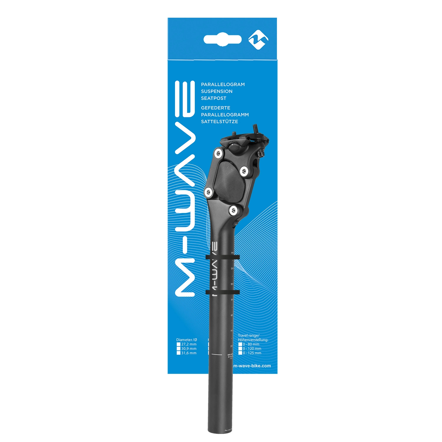Saatavilla yleisimmissä koissa: 27.2mm, 30.9 ja 31.6mm. M-wave Fourspring satulatolpan jousitus on erittäin herkkä erityisen parallelogram-jousituksen ansiosta (jouset joustavat suunnikkaana). Jousituksen vastus on säädettävä. Pituus 350mm. Tolpan kyljestä löytyy korkeusasteikko satulan korkeuden tarkkaa säätöä varten. Materiaali alumiinia.