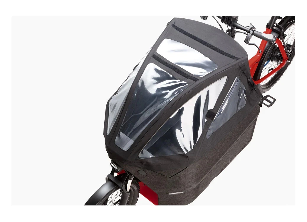 Pyörän käytettävyyden kannalta kestävä ja toimiva sadesuoja on todella tärkeä. Packster 70:n kuomu on saman tyylinen kuin Load 60:n, eli kuomu on kiinteästi kiinni etuosasta ja joustavien kaarien ansiosta takaosan korkeutta voidaan säätää. Eli jos kuorma on pieni, voi kuomun vetää alas jolloin ilmanvastus on pieni. Tai jos lasti on iso, niin kuomun voi nostaa takaa korkealle. Tällöin kuomun alla voi kuljettaa jopa 160 cm pitkää matkustajaa kypärä päässä. Laatikko on myös melko leveä ja lattian syvennys tuo mukavasti lisätilaa jaloille, ja penkin alta löytyy myös säilytystilaa esim. sadevaatteille tai ylimääräiselle lukolle.