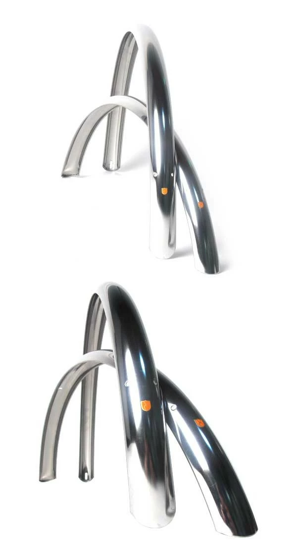 Velo Orangen sileät kiiltävät lokasuojat sopivat täydellisesti klassisiin ja elegantteihin pyöriin. Kiillotettua kevyttä alumiinia, pituus edessä 80 cm ja takana 110 cm. Kaikki tarvittavat kiinnikkeet kuuluvat pakettiin: 5mm alumiiniset aisat, r-klipsit ja ruuvit, vetopultit aisojen kiinnittämiseksi lokasuojaan, nahkaprikat, kiinnikkeet ja darumapultti jarrusillan kiinnitystä varten. Lokasuojissa on valmiiksi rei’itys. 45 mm koko sopii maksimissaan noin 35 -millisille renkaille, 622- ja 27″ -vannekoon pyöriin.
